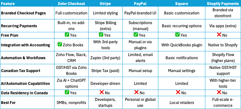 Enter Zoho Checkout, an intuitive, secure, and highly customizable solution that helps small businesses and nonprofits create branded checkout pages, automate payment collection, and integrate seamlessly with accounting and CRM systems. This guide explores how Zoho Checkout stacks up against other industry players like Stripe, PayPal, Square, and Shopify Payments while demonstrating why it’s especially powerful for Canadian businesses.